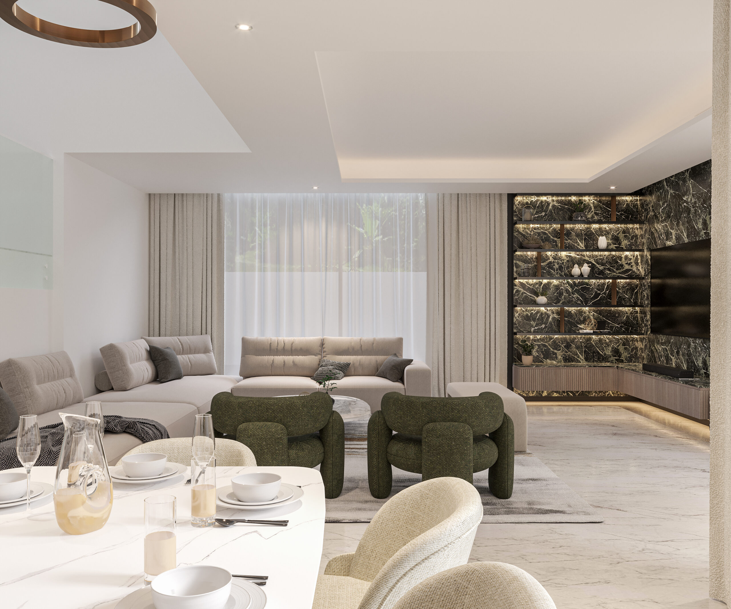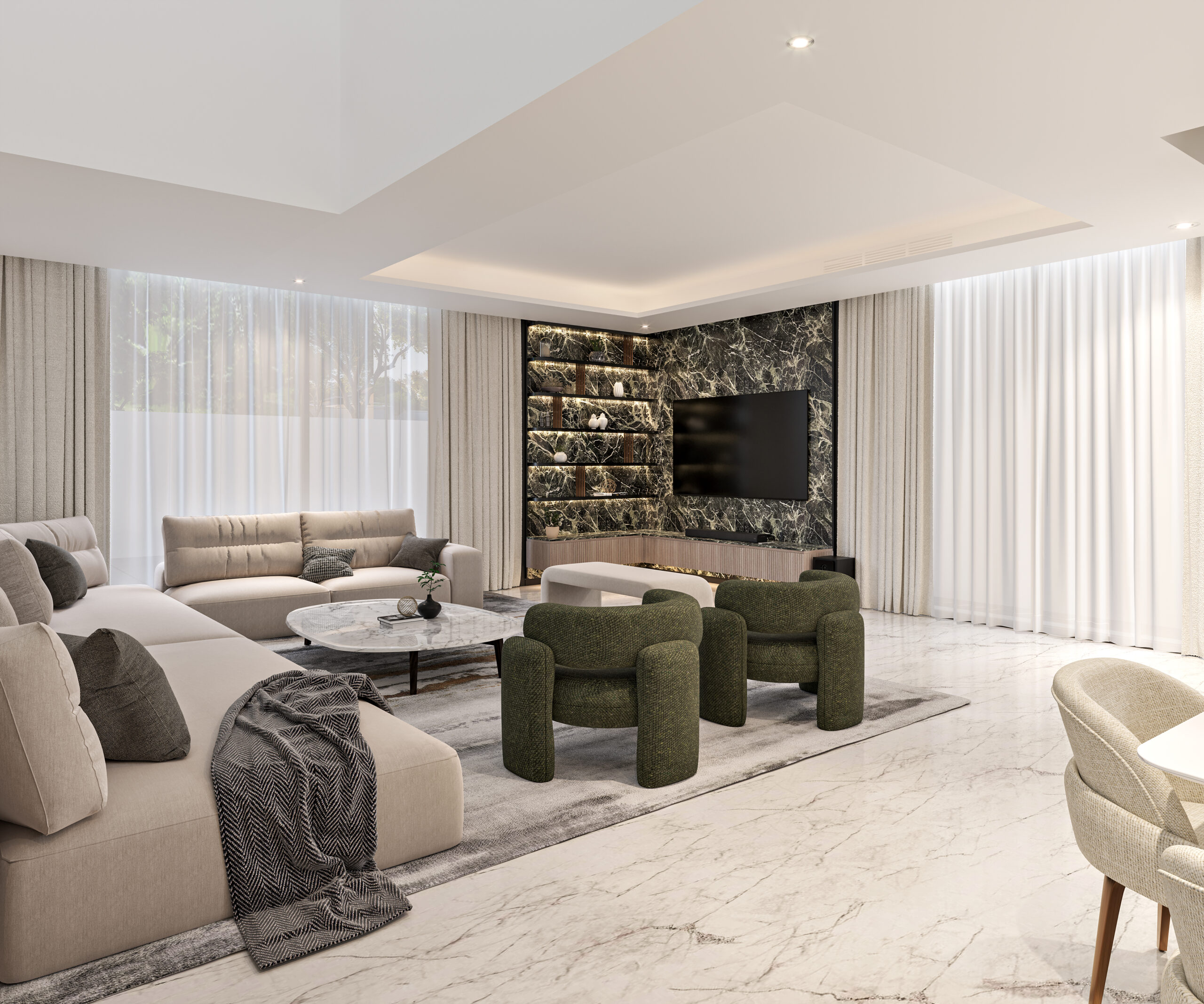 Nestled in the lush surroundings of Barari, this villa will embody a refined balance between minimalism and modern luxury, creating a serene yet striking living experience. Designed to exude understated elegance, the space will seamlessly merge clean lines with rich, curated details, offering a contemporary retreat in the heart of nature.Minimalist Essence, Elevated : The villa’s design will celebrate the art of simplicity, where each element is meticulously chosen to enhance spatial harmony. Crisp architectural lines and uncluttered interiors will set the stage for a calming ambiance, while statement materials add depth and character.Modern Accents with a Bold Edge: A restrained, neutral palette will be punctuated by refined bronze details, lending warmth and sophistication to the space. Subtle metallic highlights will be incorporated into fixtures, trims, and bespoke furniture pieces, elevating the minimalist aesthetic with a touch of opulence.Eccentric Marble as a Focal point: The striking presence of eccentric marble cladding will act as a defining feature, infusing the interiors with dynamic movement and visual intrigue. Each slab, carefully selected for its unique veining and character, will stand as a piece of art, seamlessly blending nature’s raw beauty with modern refinement.